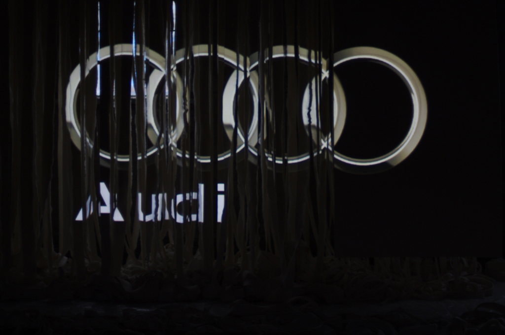 This sculpture was produced in collaboration with the Toronto architectural firm RAW design. 18 km of felt cut offs were hung as an entry sculpture for the Interior Design Show 2012. It consisted of 1,300 individual strips of felt and was called Strip Tease. Christie Digital provided an interactive wall that projected patterns, images of guests and sponsors onto the hanging strip "canvas". The sculpture surrounded the two entry escalators with the 15 meter long strips and created the unique large vertical projection screen with front-projection using two Christie projectors capable of delivering brightness levels of 20,000 lumens. Show visitors experienced a live video camera feed of themselves interacting with the content as well as video feed of the IDS lectures and sponsor logos.